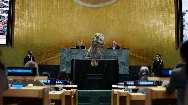 Un dinosaurio irrumpe en la ONU y exige a los líderes mundiales no “elegir la extinción”
