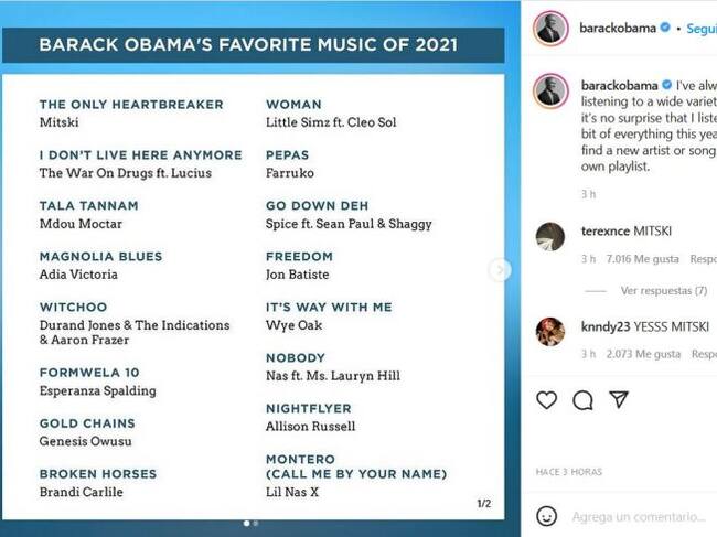 «Siempre me ha gustado escuchar una amplia variedad de música, así que no es de extrañar que haya escuchado un poco de todo este año. Espero que encuentres un artista o una canción nuevos para agregar a tu propia lista de reproducción», comentó Barack Obama.