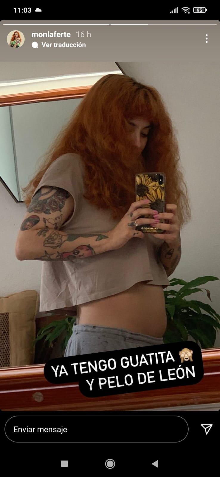 Sin ir más lejos hace sólo algunas horas la voz tras «Amor Completo» publicó a través de sus historias en Instagram una fotografía, la primera, donde se puede ver el desarrollo de su embarazo. En la imagen se le puede ver frente a un espejo junto al texto «ya tengo guatita y pelo de león», en relación a su alborotada cabellera.