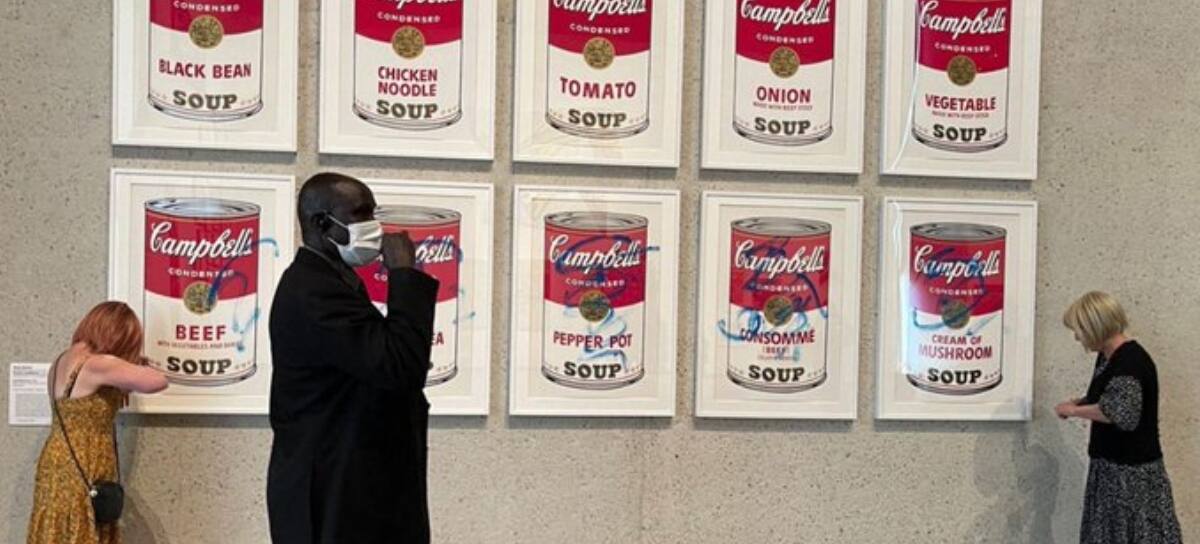 ¡Se está volviendo algo común! Este miércoles 9 de noviembre, dos activistas disfrazadas con pelucas se adhirieron con pegamento a la famosa obra de Andy Warhol “Latas de sopa Campbell”.