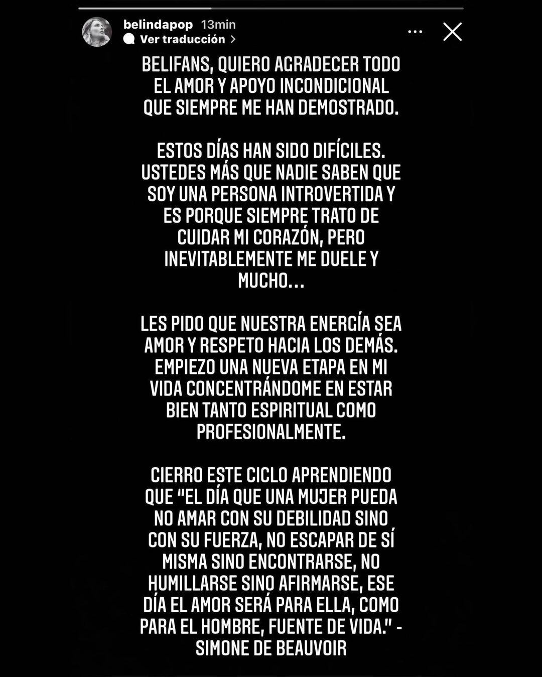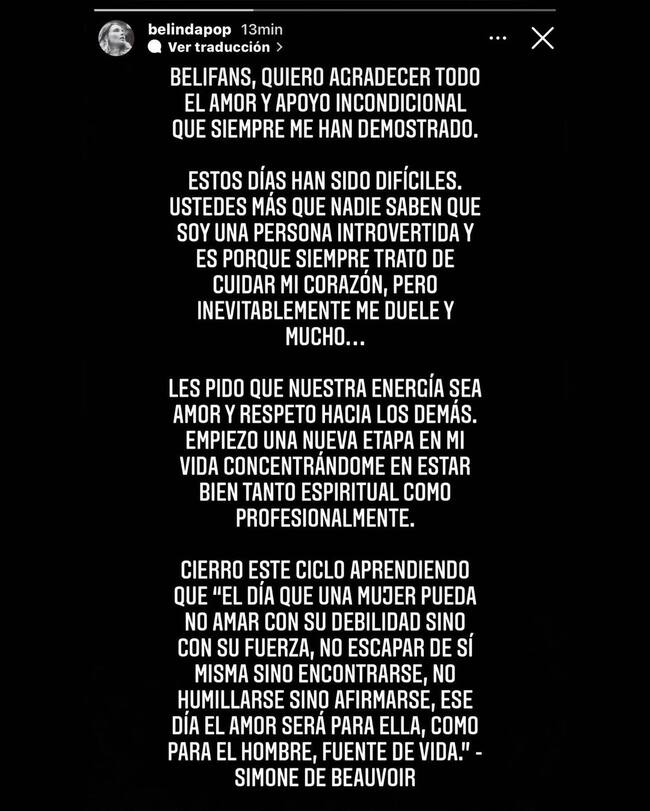 “Empiezo una nueva etapa en mi vida concentrándome en estar bien, tanto espiritual como profesionalmente”, añadió Belinda junto con pedir apoyo emocional para poder llevar de mejor manera su duelo sentimental por Nodal.