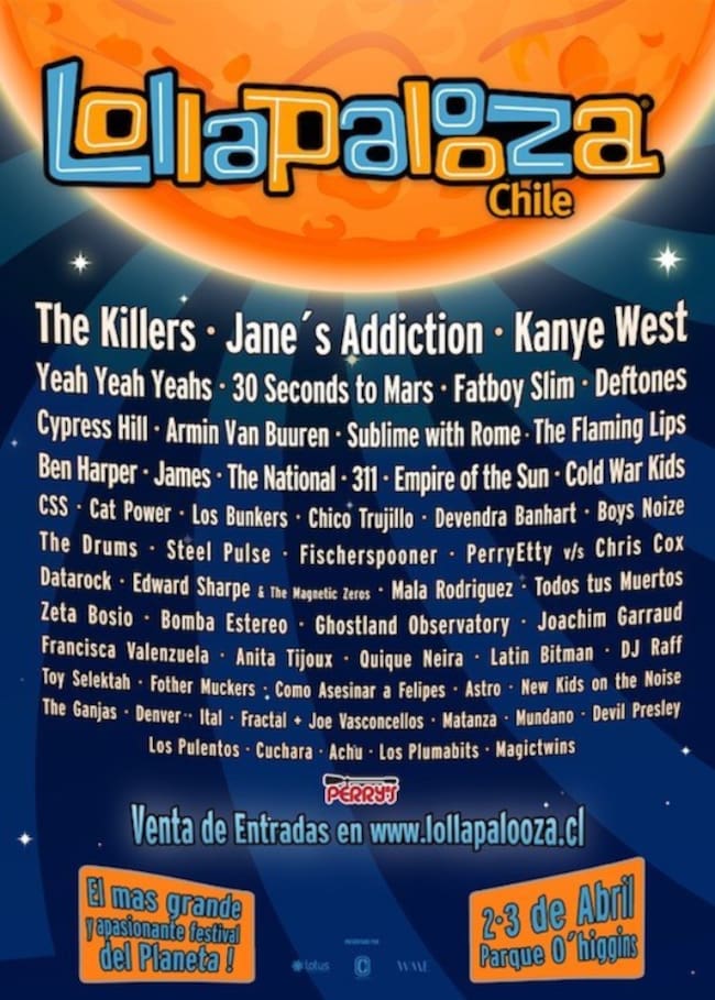 Entre los destacados, estaban The Killers, Deftones, Kanye West, 30 Seconds To Mars, Jane’s Addiction, Deftones, Cypress Hill, Mala Rodríguez, Fran Valenzuela, Ana Tijoux, entre otros.