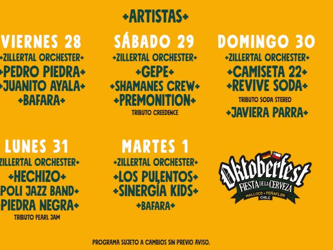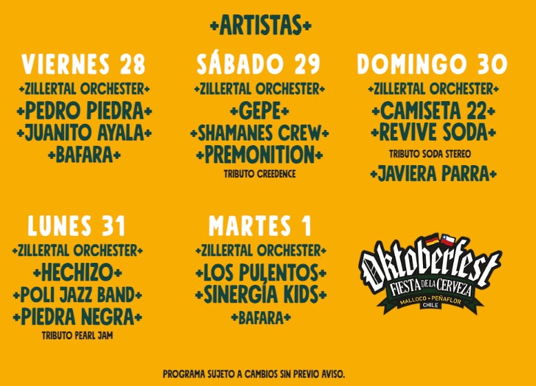 En esta ocasión, el evento contará con una parrilla de artistas de primer nivel y con los mejores exponentes de la cumbia, el reggae y el pop, entre los que destacan; Pedro Piedra, Juanito Ayala, Gepe, Shamanes Crew, Javiera Parra, entre otros, junto a Zillertal Orquesta que tiene más de 60 años de historia interpretando música tirolesa.