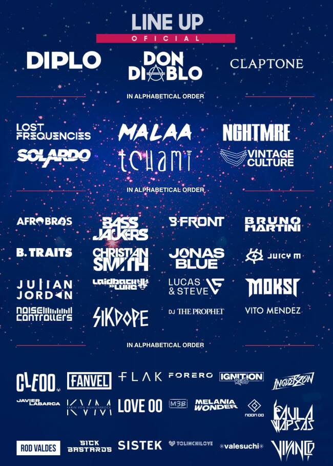 Esta parrilla de artistas nacionales se suma a los DJs que encabezan el lineup de alta categoría, entre los cuales están Diplo, Don Diablo, Calptone, Lost Frequencies, Malaa y muchos más.
