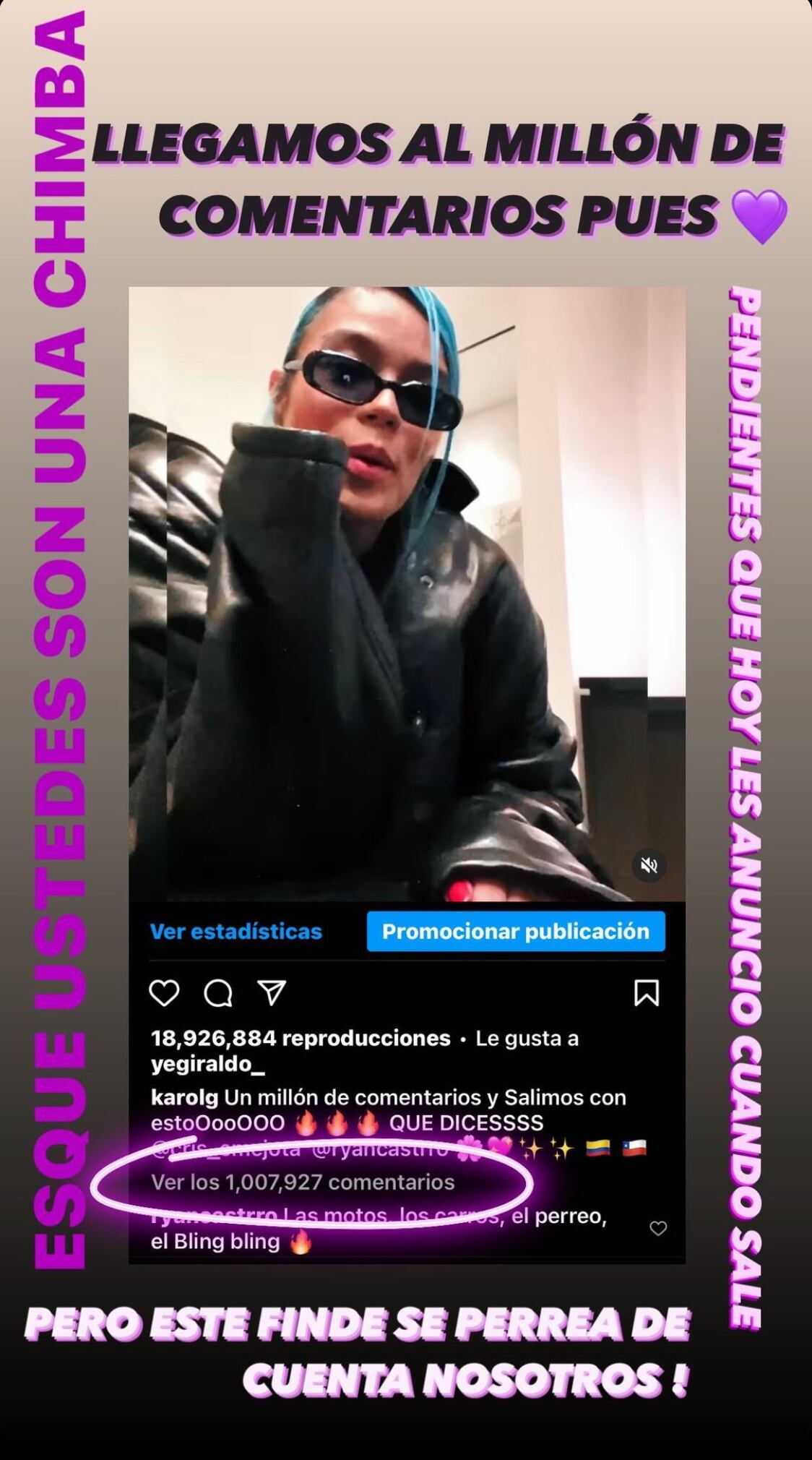 A través de stories, Karol G anunció que sus seguidores habían cumplido su meta: “ES QUE USTEDES SON UNA CHIMBA”, agregó.