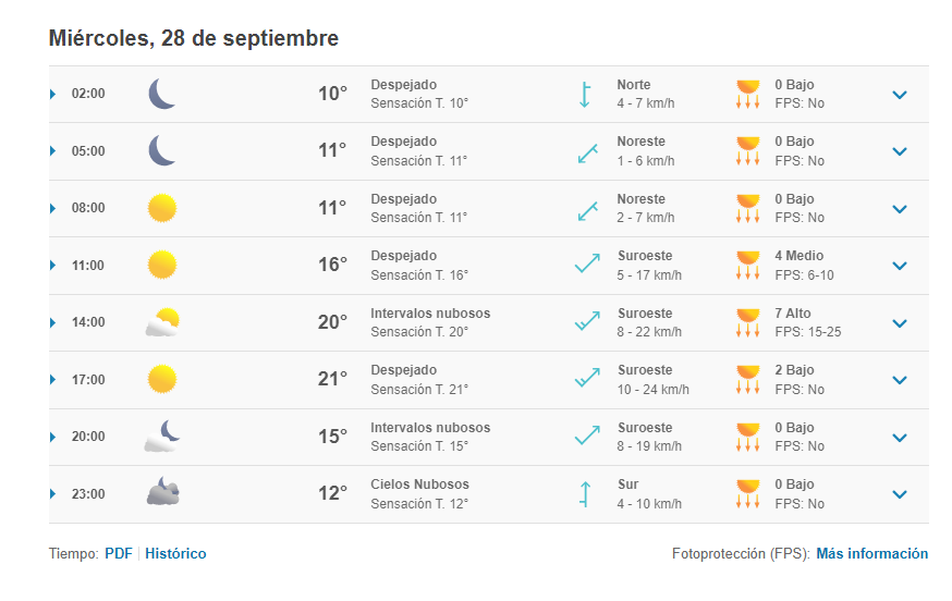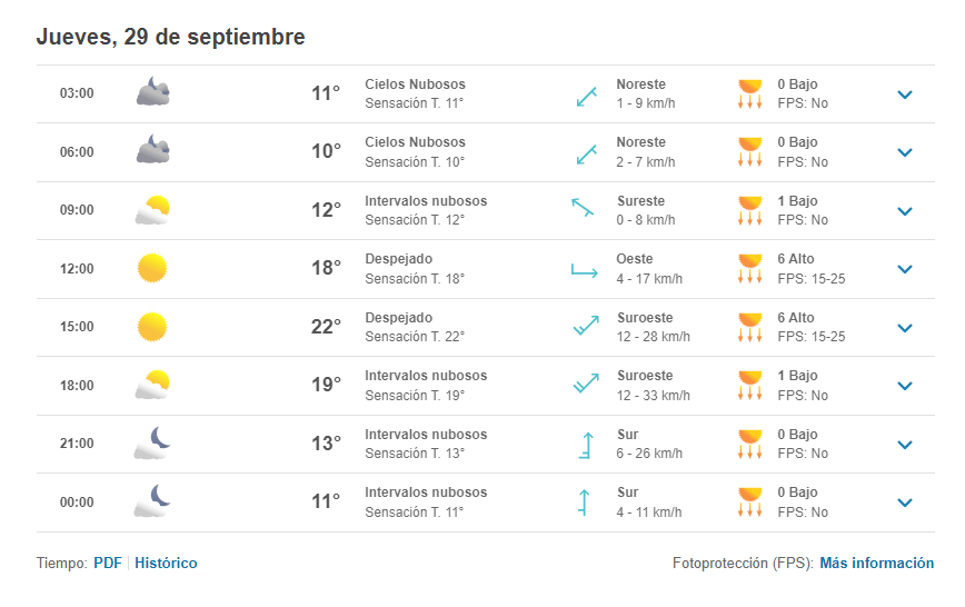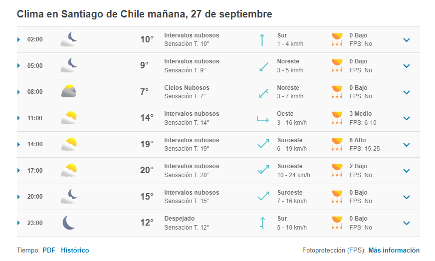 En lo que al martes 27 de septiembre, el primero de sus shows en el Estadio Nacional se refiere, la mínima será de 6 y la máxima de 20 grados, donde la mayor parte de la jornada estará nublada.