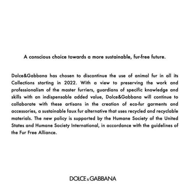 En una declaración conjunta con el grupo de defensa de los derechos de los animales Humane Society International, D&G afirmó que eliminará las pieles a partir de este año. Asimismo, dijo que continuara trabajando con “maestros del cuero”.