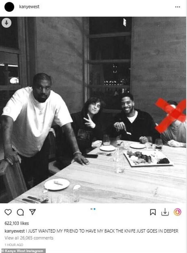 Al respecto, subió una imagen en la que ambos aparecen juntos con Pete Davidson y Timothée Chalamet: “Yo sólo quería que mi amigo me cubriera la espalda, pero el cuchillo cada vez va más profundo”, escribió West en la descripción de la imagen.