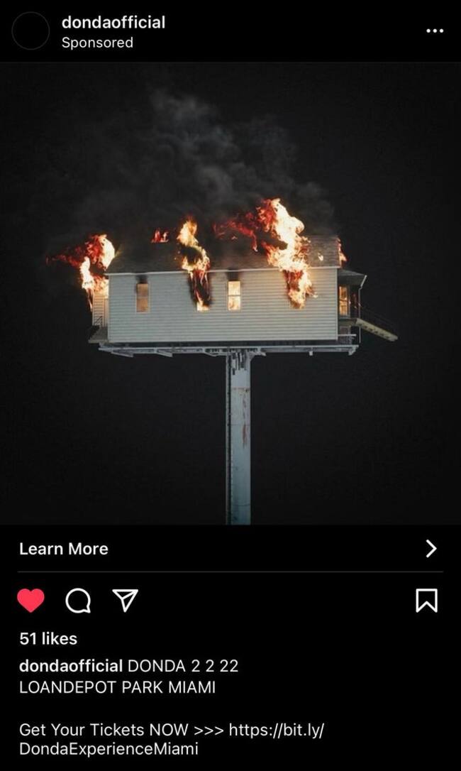 El post mostraba una casa sobre pilotes envuelta en llamas, aparentemente relacionada con la estructura que se asemeja a la casa en la que creció. La misma que construyó dentro del estadio Soldier Field de Chicago antes de su primera fiesta escucha de 2021.