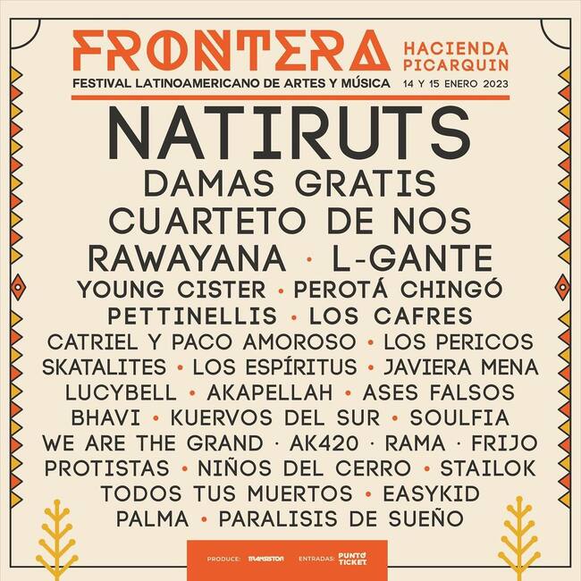 El evento se realizará en la Hacienda Picarquín los días 14 y 15 de enero de 2023. Respecto a las entradas para el festival Frontera, estas saldrán a la venta a partir de este miércoles a través de Punto Ticket.