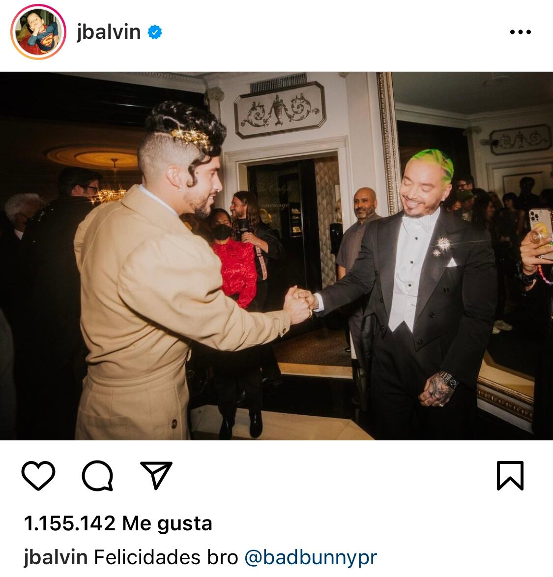 J Balvin (a quien se refirió Daddy Yankee en su última entrevista) le dedicó un post a Benito Martinez para saludarlo, publicando una foto juntos en la Met Gala 2022.