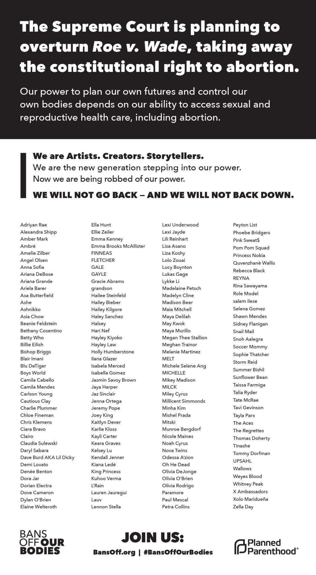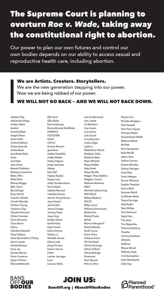 En la firma firmada, hay nombres como Ariana Grande, Angel Olsen, Billie Eilish, Demi Lovato, FINNEAS, Halsey, Miley Cyrus, Mitski, Olivia Rodrigo, Paramore, Phoebe Bridgers, Rina Sawayama, Selena Gomez, Shawn Mendes, Weyes Blood entre otros.