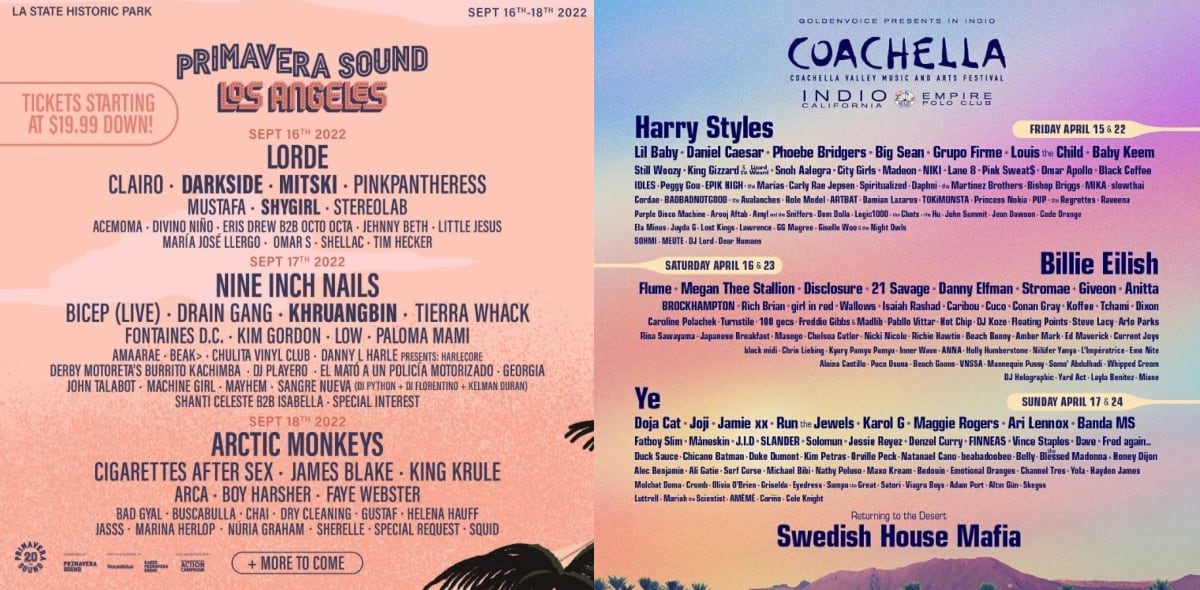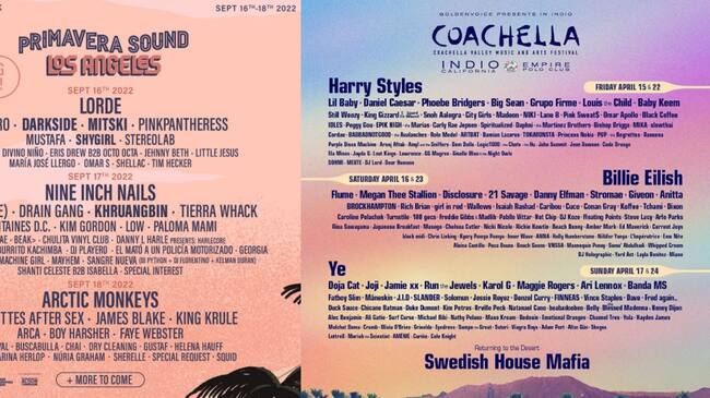 Mientras que Coachella también sirve como referencia con rostros como Harry Styles, Billie Eilish, Kanye West, Swedish House Mafia, Doja Cat, Disclosure, Flume, entre otros.