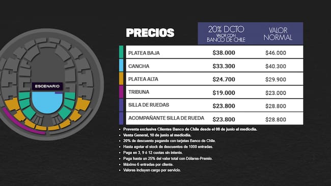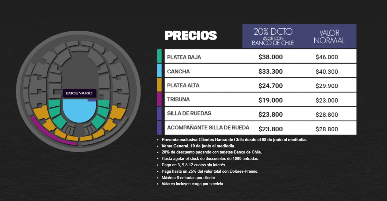Las entradas estarán a la venta a través del sistema Punto Ticket y se pondrán a la venta a partir de este 8 de junio a las 12:00 horas. Eso sí, eso será una preventa exclusiva para clientes del Banco de Chile.