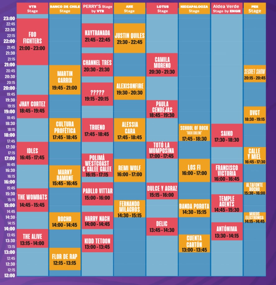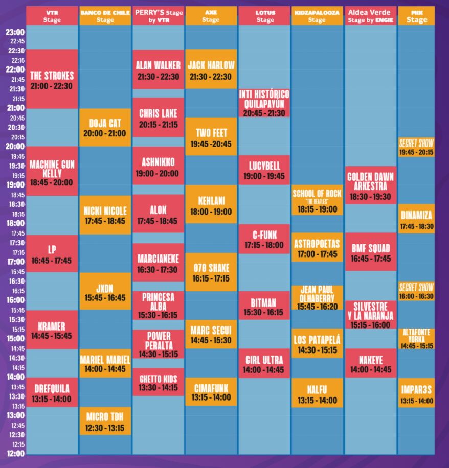 Debido a que Jane’s Addiction tocaba el día viernes, habrán modificaciones respecto a horarios. Por ejemplo, Jhay Cortez ahora cantará a las 18:45 en vez de cerrar la noche. En tanto, Justin Quiles finalizará la jornada.