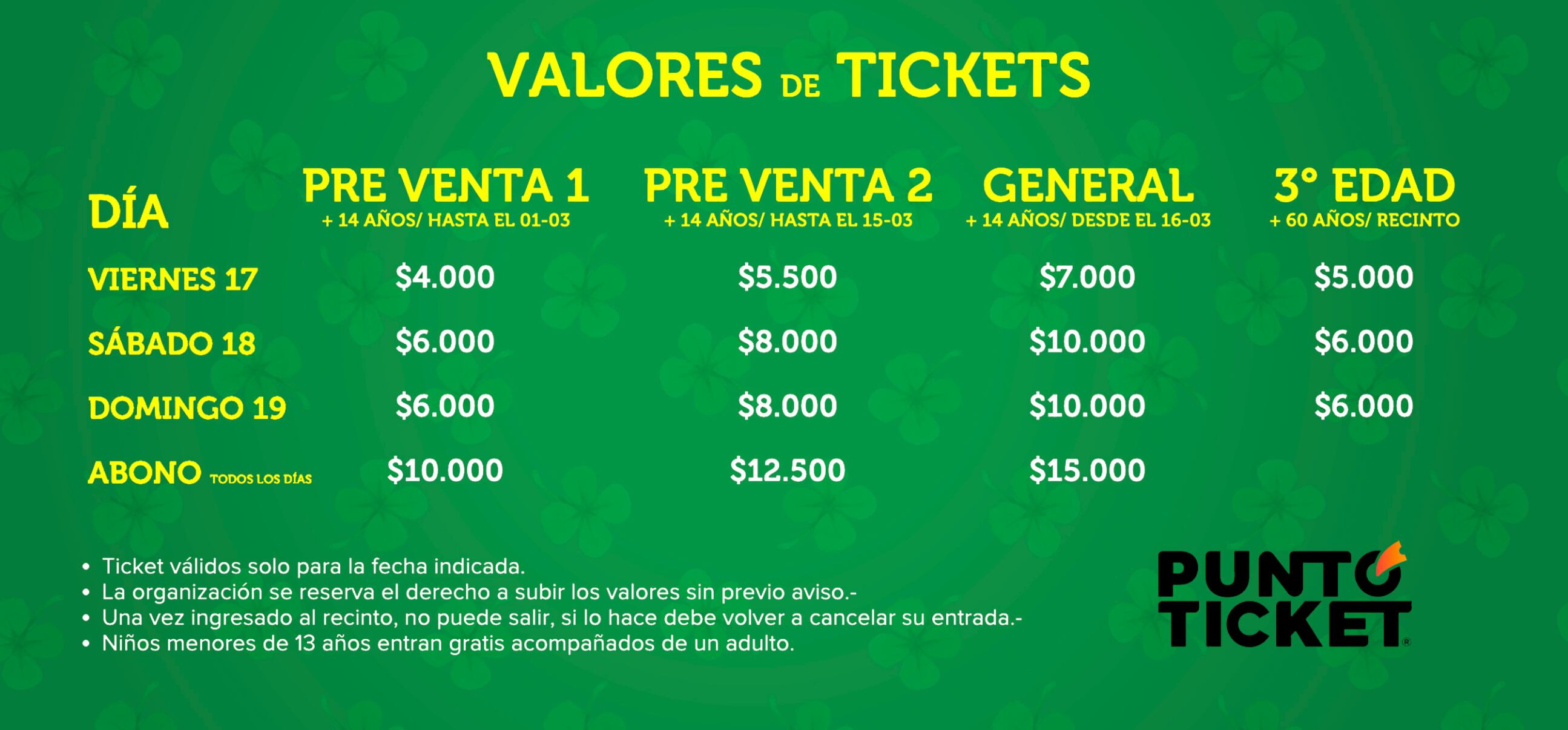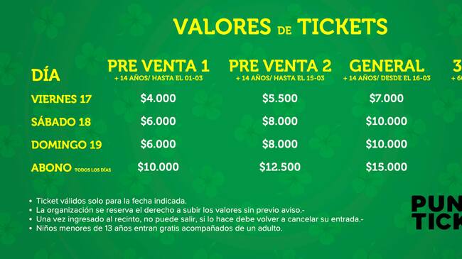 Las entradas están disponibles a través de PuntoTicket. La primera preventa es desde los $4.000 más cargo por servicio hasta el 1 de marzo, mientras que el valor por el abono por los tres días es de $10.000 más cargo por servicio.
