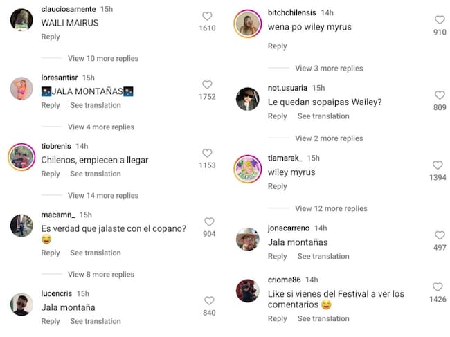 «WAILI MAIRUS»; «JALA MONTAÑAS»; «Chilenos empiecen a llegar»; «Es verdad que jalaste con el Copano?»; «Sácate una línea Jala Montaña», fueron algunos de los comentarios.