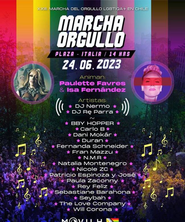 En tanto, el Movilh ha anunciado que la animación de la Marcha del Orgullo en Santiago, estará a cargo de Isa Fernández y Paulette Favres.