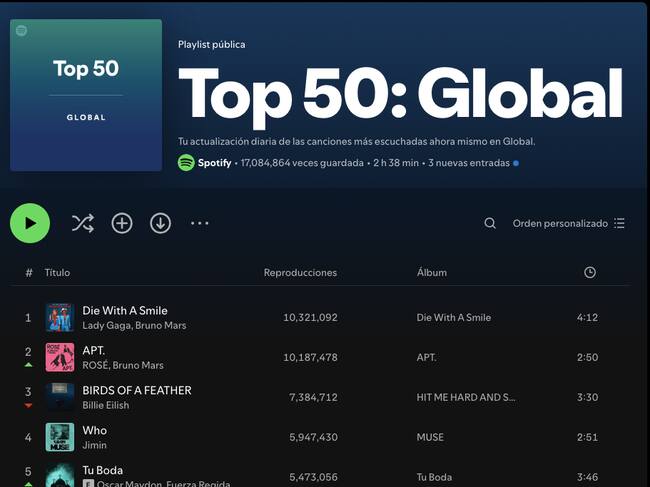 A casi dos meses de su estreno (16 de agosto), la canción de Lady Gaga junto al estadounidense se tomó el primer lugar del Top 50 Global Spotify. "Die With a Smile" ya acumula más de 10 millones de reproducciones en la plataforma, siendo un hit reconocido internacionalmente.