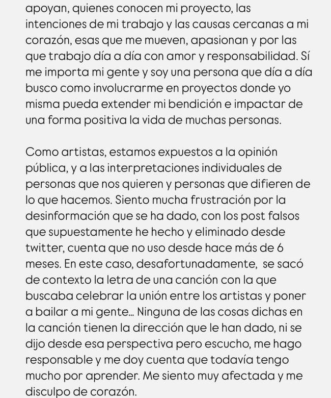 "Siento mucha frustración por la desinformación que se ha dado, con los post falsos que supuestamente he hecho y eliminado desde Twitter, cuenta que no uso desde hace más de 6 meses. En este caso desafortunadamente se sacó de contexto la letra de una canción con la que buscaba celebrar la unión entre los artistas y poner a bailar a mi gente...", continúa la exponente.