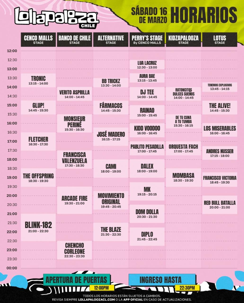 A lo largo del día, los asistentes podrán movilizarse dentro del recinto y disfrutar de los espectáculo de artistas como Glup!, Kidd Voodooo, The Alive!, Fletcher, Pablito Pesadilla, Cami, The Offspring y más.