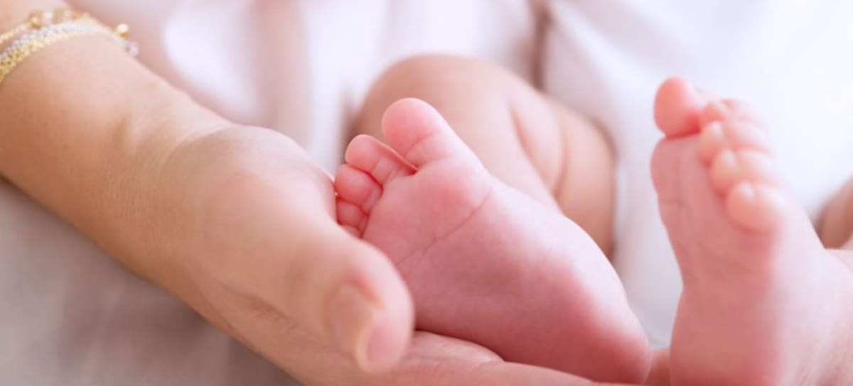 Mother hand holding cute tiny baby feet, doing massage for little newborn child, happy motherhood, protection and safety concept / Anna Omelchenko