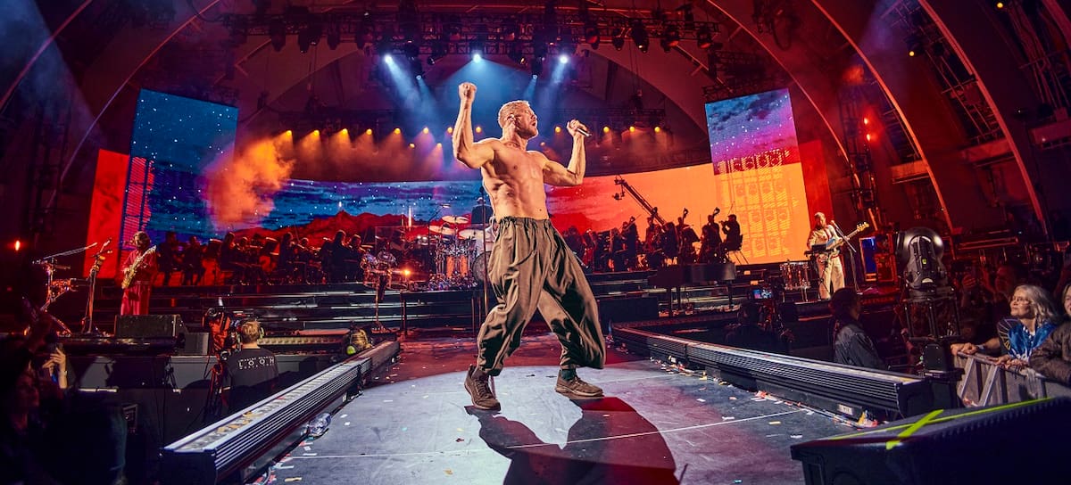 Dan Reynolds, vocalista de Imagine Dragons, sobre el escenario del Hollywood Howl acompañado de la LA Film Orchestra. / ANDI ELLOWAY