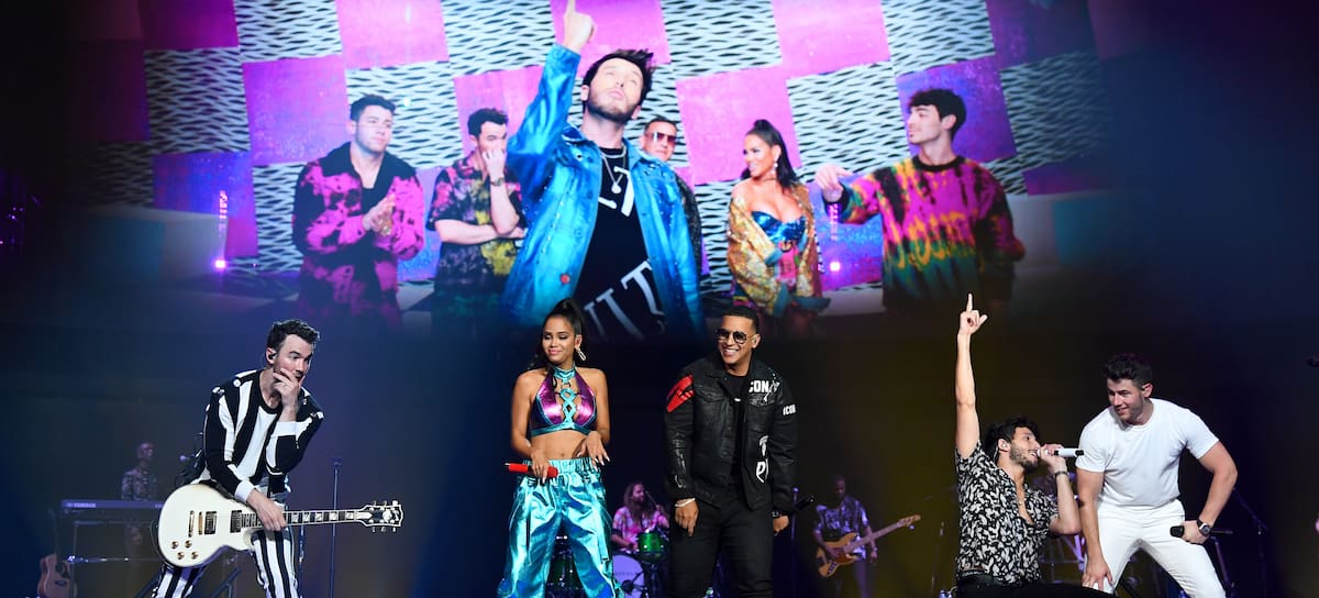 The Jonas Brothers, en el escenario con Natti Natasha, Daddy Yankee y Sebastian Yatra durante la apertura de su 'Happiness Begins Tour 2019. / Kevin Mazur