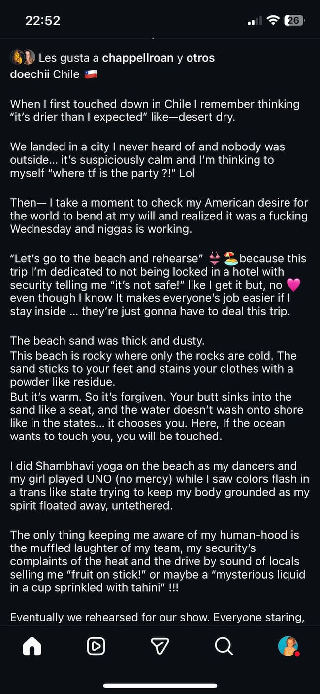 "Cuando aterricé por primera vez en Chile recuerdo haber pensado "es más seco de lo que esperaba", como seco del desierto. Aterrizamos en una ciudad de la que nunca había oído hablar y no había nadie fuera... 'está sospechosamente tranquilo', pensé, '¡¿dónde demonios está la fiesta?!'",, revela Doechii.