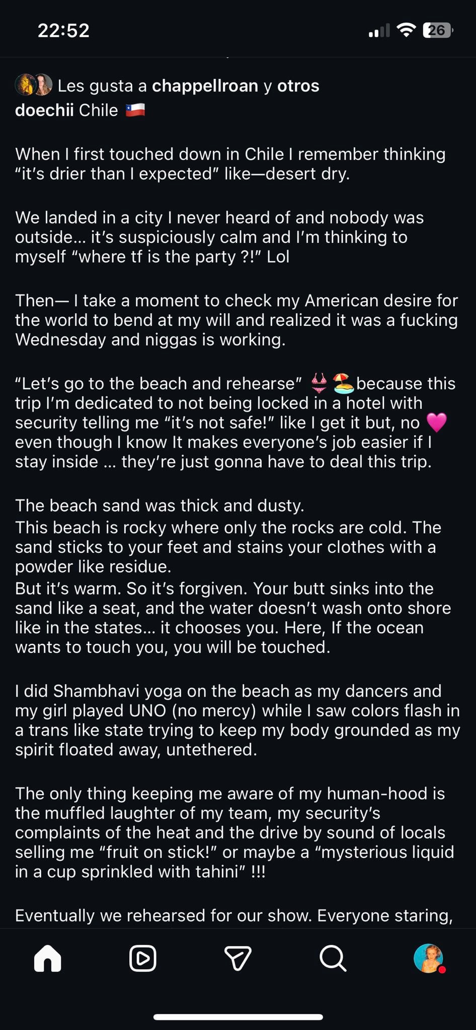 "Cuando aterricé por primera vez en Chile recuerdo haber pensado "es más seco de lo que esperaba", como seco del desierto. Aterrizamos en una ciudad de la que nunca había oído hablar y no había nadie fuera... 'está sospechosamente tranquilo', pensé, '¡¿dónde demonios está la fiesta?!'",, revela Doechii.